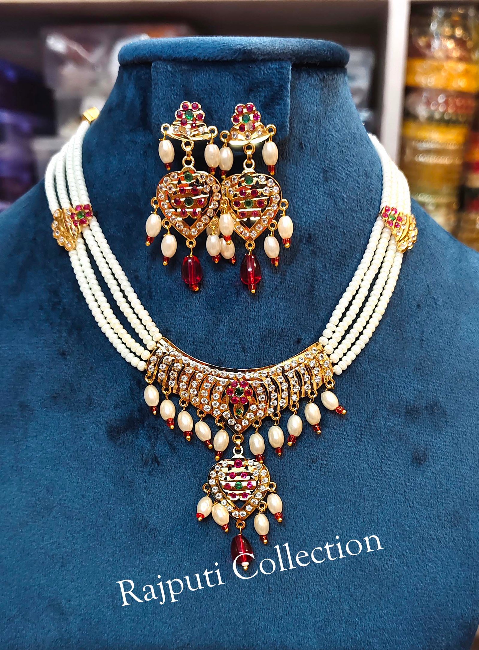 Celebrate royal heritage with this exquisite Rajputi Jadau microplish neckset. Featuring intricate craftsmanship and sparkling embellishments, it’s perfect for weddings, festivals, and traditional occasions. Add a majestic touch to your ethnic ensemble with this timeless piece.