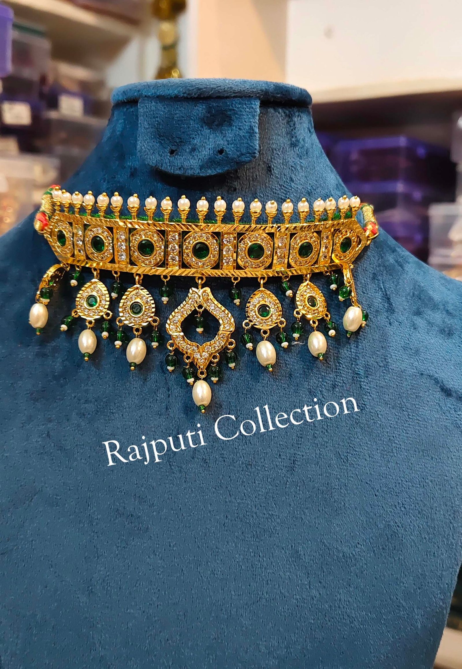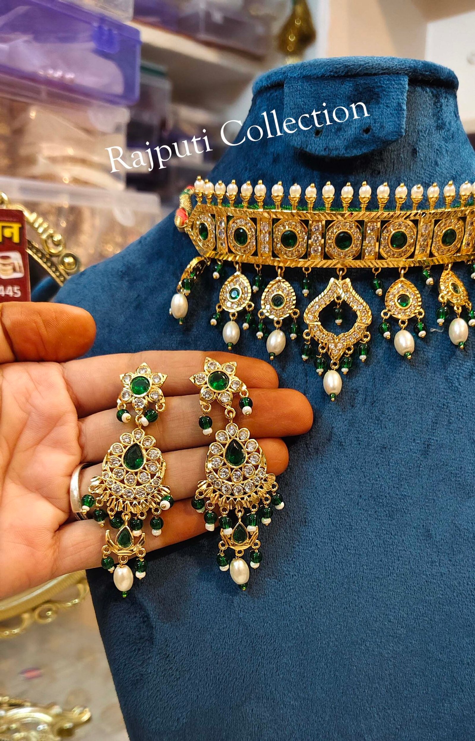 Step into regal elegance with this Rajwadi Neckset and Earring set. Inspired by royal heritage, it features intricate designs and rich detailing — perfect for weddings, traditional events, and festive celebrations.